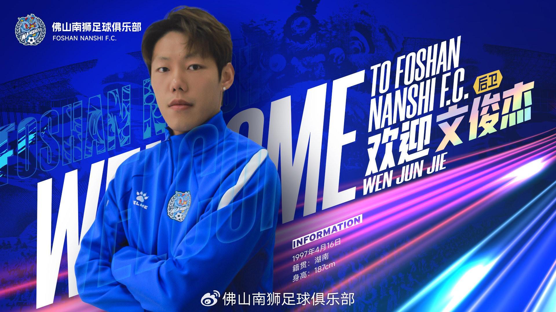 北京时间3月3日,官方消息,佛山南狮签下门将石笑天、后卫文俊杰。